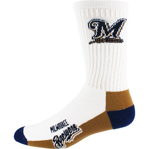 Dress in classic team style any day of the year with these cool Milwaukee Brewers crew socks! Soft white crew socks feature the team logo at ankle, team color details at heel and toe, plus knit team name across the side of each sock. Since the design is woven right into the sock, it will stretch and move with it, and never bind or crack.